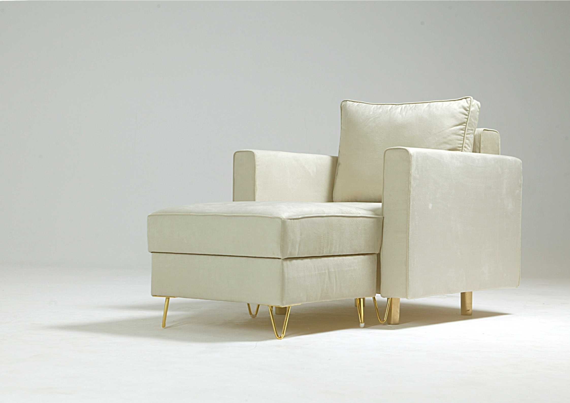 Tapicerowany Fotel z kolekcji DES to elegancki fotel na złotych metalowych nogach, który kryje pod siedziskiem pojemnik na drobiazgi. W kolekcji DES dostępny jest również fotel rozkładany, sofa, pufa oraz narożnik.
