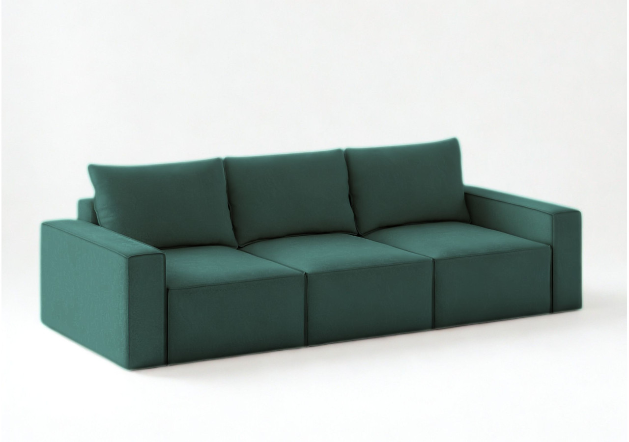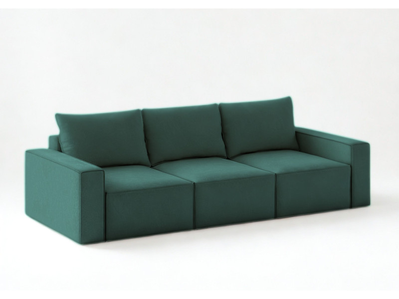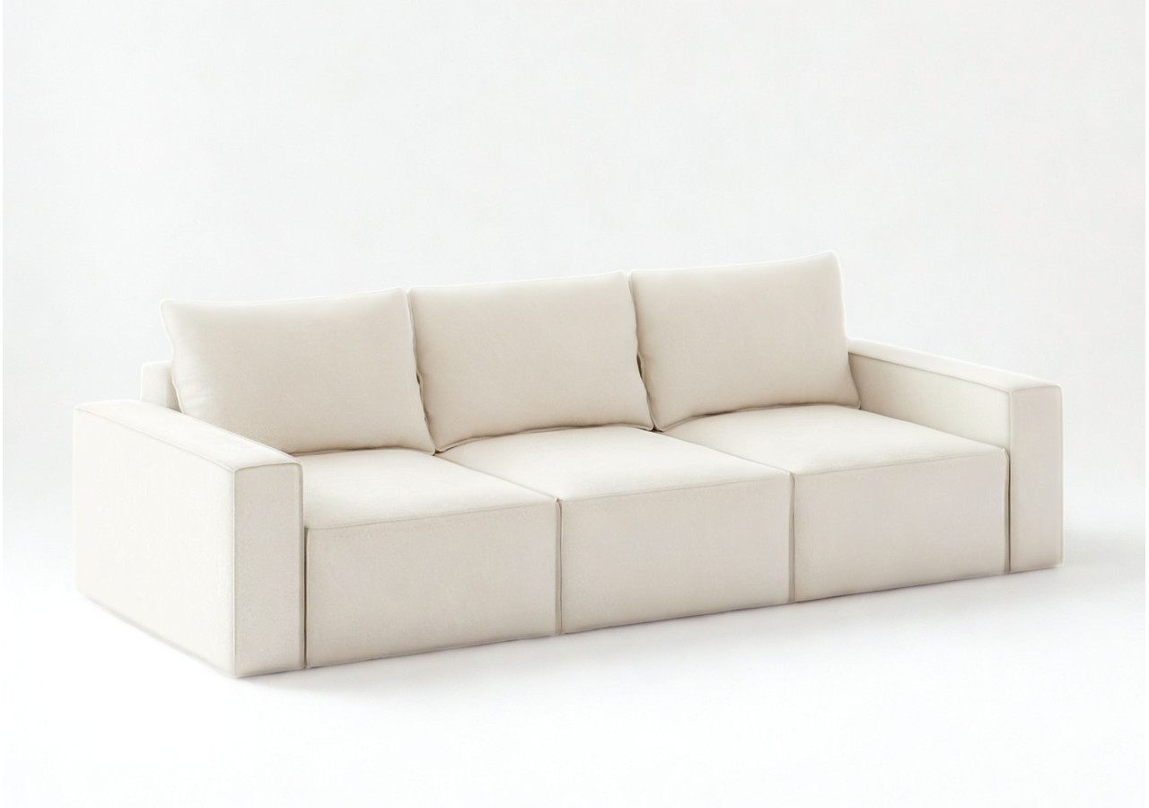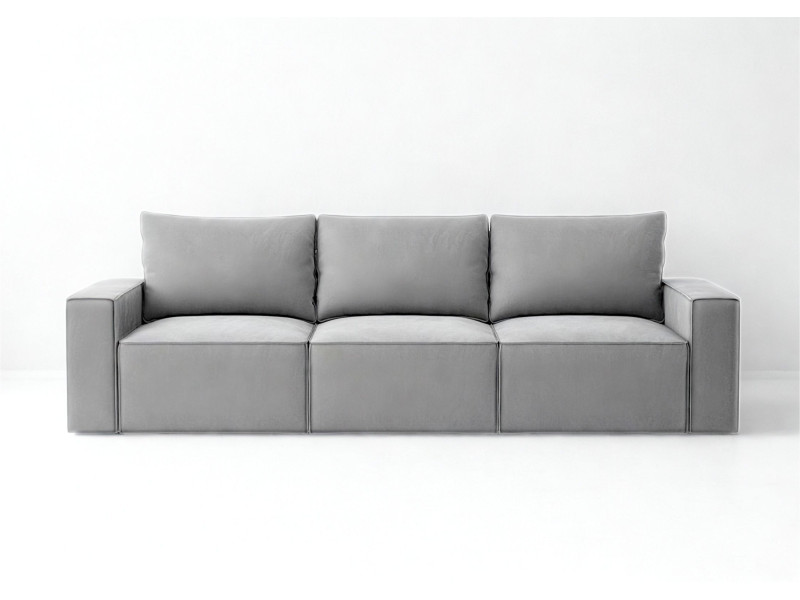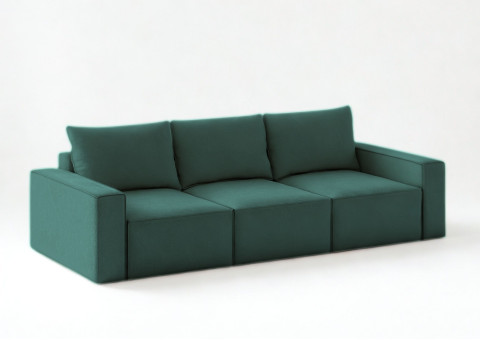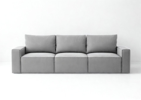 Modułowa sofa rozkładana SENS z pięknymi przeszyciami w stylu angielskim. Jest to szew zewnętrzny zastosowany na krawędziach mebla. Kanapa posiada 3 pojemniki na pościel. Po jednym pod każdym siedziskiem. Moduły możne rozłożyć niezależnie od innych. Po rozłożeniu wszystkich trzech uzyskamy dużą powierzchnię spania o wymiarach 240x160cm. Głębokość siedziska to 100cm. W zestawie znajdą Państwo 3 duże poduszki oparciowe. Pokazujemy na aranżacjach również zdjęcia w jaki sposób można zaaranżować sofę z większą ilością poduszek ozdobnych.