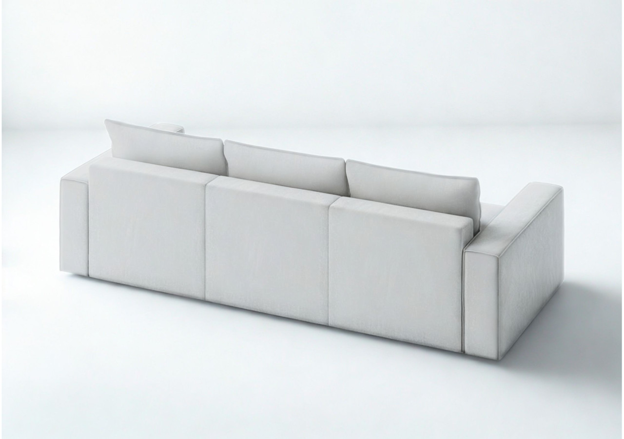 Mebel obijamy w całości tkaniną obiciową. Jest więc to mebel wolnostojący. Poduszki wypełniane granulatem piankowym lub silikonem tworzą stabilne oparcie. Wypełniamy je mocno ponieważ przez najbliższe tygodnie użytkowania objętość wkładu zmniejsza się. Poduszki szyjemy z zamkami błyskawicznymi.