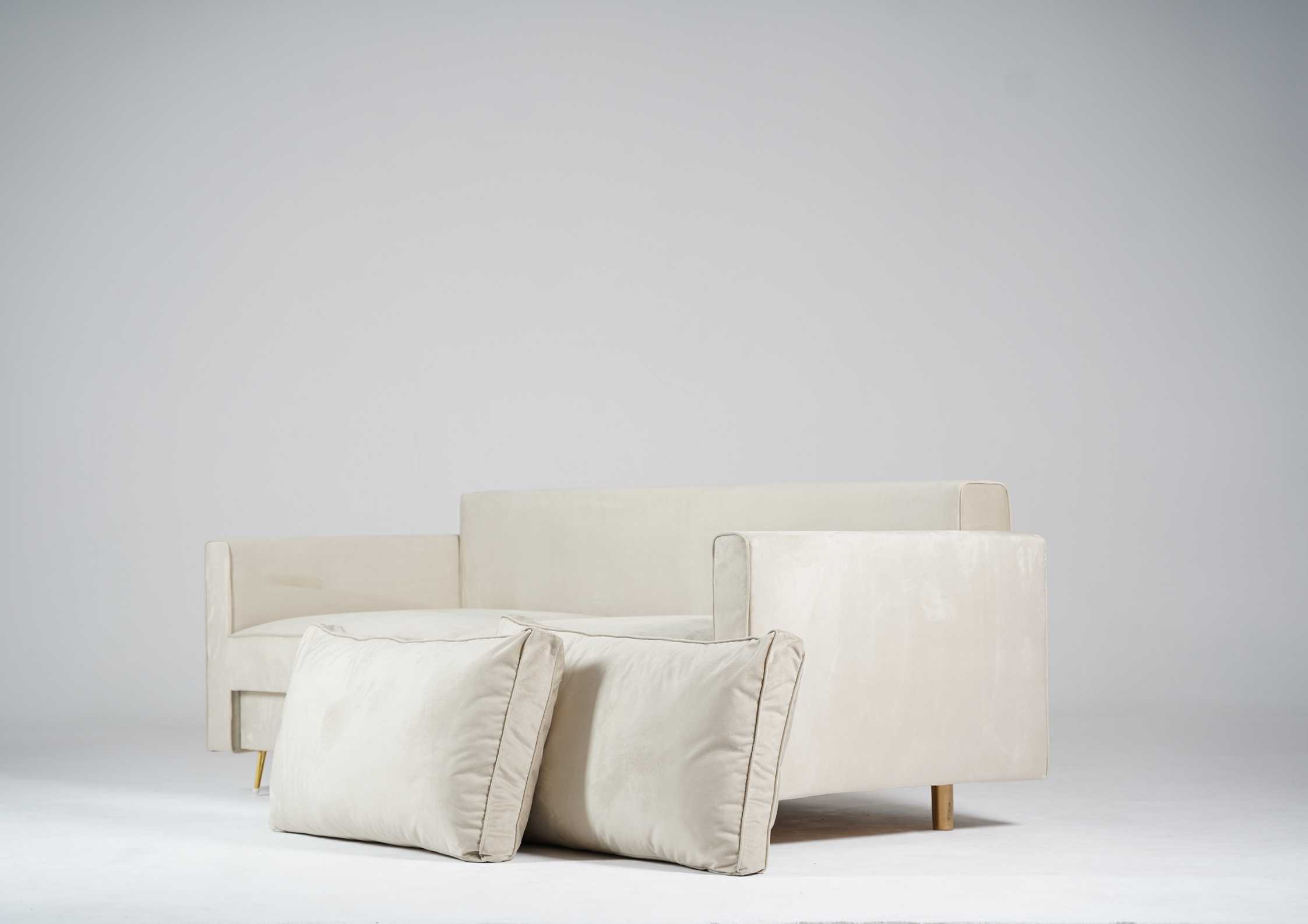 Sofa na złotych nogach DES posiada 2 duże poduszki, które tworzą oparcie. Mebel obijamy w całości tkaniną obiciową. Jest to mebel wolnostojący. Poduszki wypełniane granulatem piankowym lub silikonem tworzą stabilne oparcie. Wypełniamy je mocno ponieważ przez najbliższe tygodnie użytkowania objętość wkładu zmniejsza się. Każda poduszka posiada zamek błyskawiczny, dzięki czemu możemy zdejmować poszewki i dowolnie zmieniać ich kolor, czy po prostu prać w pralce.