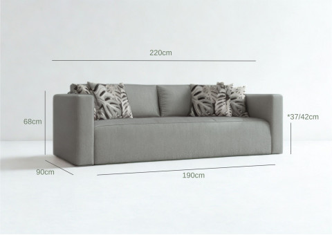Mebel obijamy w całości tkaniną obiciową. Jest więc to mebel wolnostojący. Poduszki wypełniane granulatem piankowym lub silikonem tworzą stabilne oparcie. Wypełniamy je mocno ponieważ przez najbliższe tygodnie użytkowania objętość wkładu zmniejsza się. Poduszki szyjemy z zamkami błyskawicznymi.