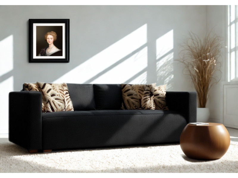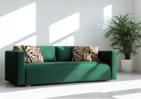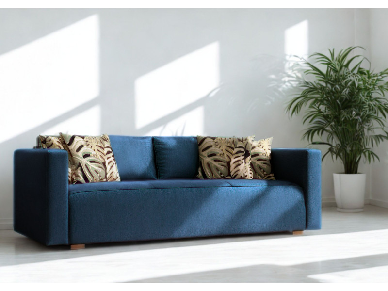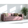 Ekskluzywna sofa z funkcją spania. Piękne drewniane nogi i duże poduszki oparciowe. W zestawie ozdobne jaśki oraz duża skrzynia na pościel. Skonfiguruj swoje wypełnienie, tkaninę oraz kolor.