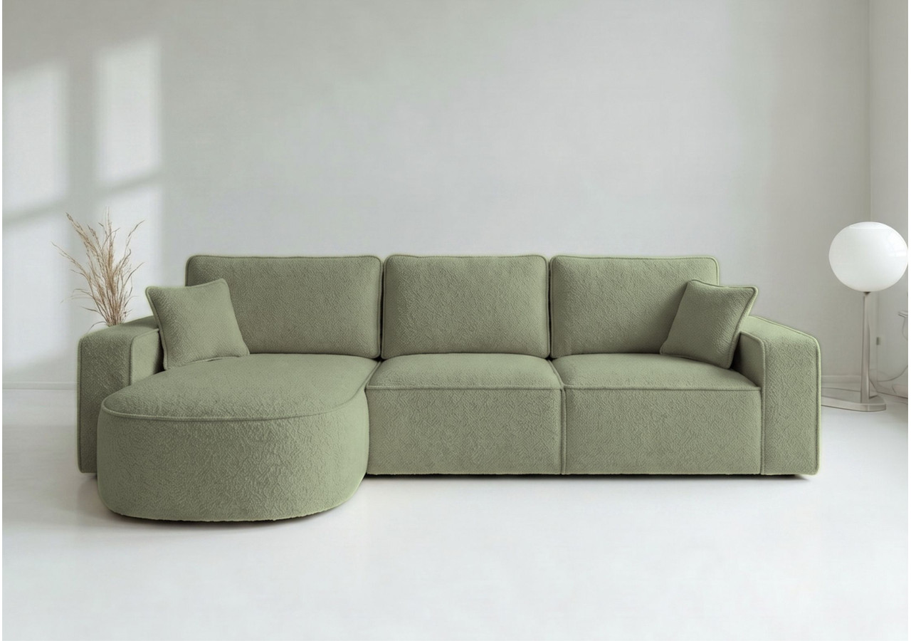 - Narożnik wykonany jest w tkaninie bouclé CENTAUR w zielonym kolorze.