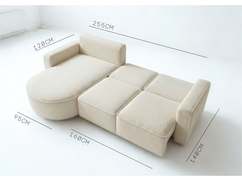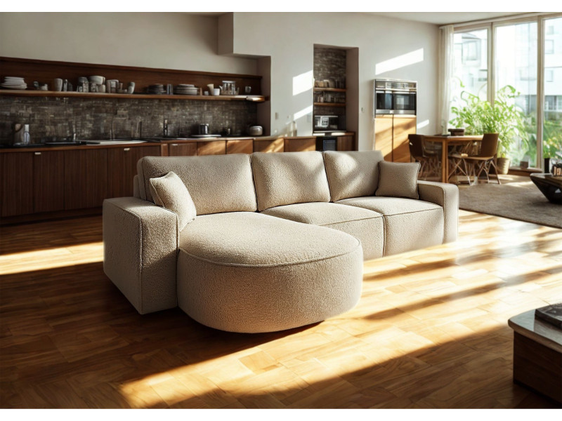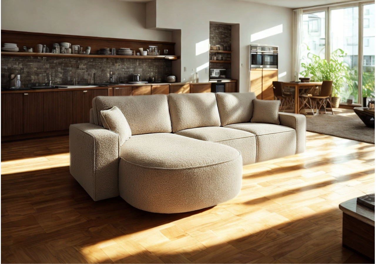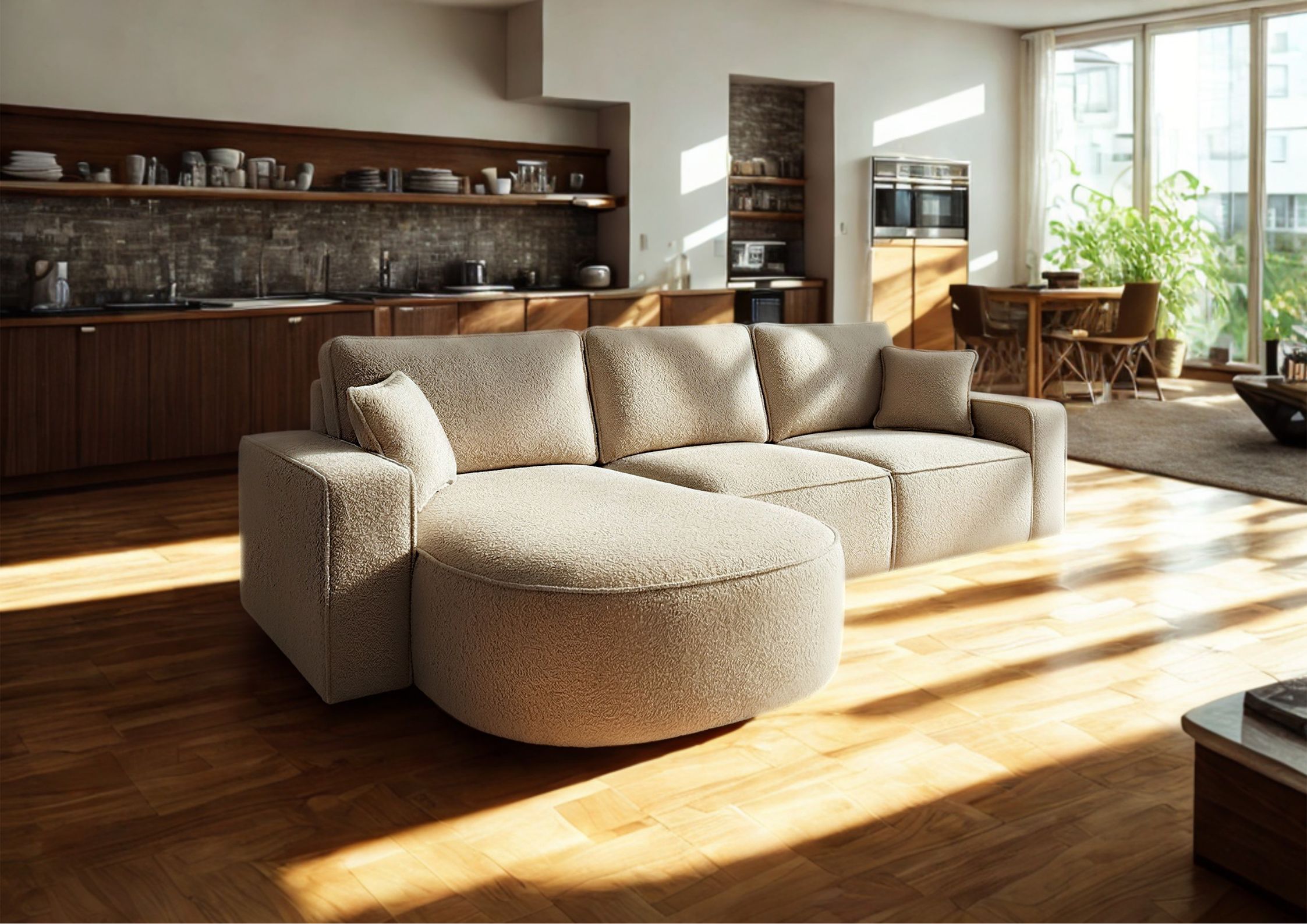 Narożnik GAMMA to duży i wygodny model do salonu, stworzony z myślą o codziennym komforcie. Przestronna powierzchnia siedzisk, podłokietniki oraz miękka tkanina bouclé sprawiają, że mebel dobrze sprawdzi się podczas odpoczynku, spotkań z rodziną i okazjonalnego spania.