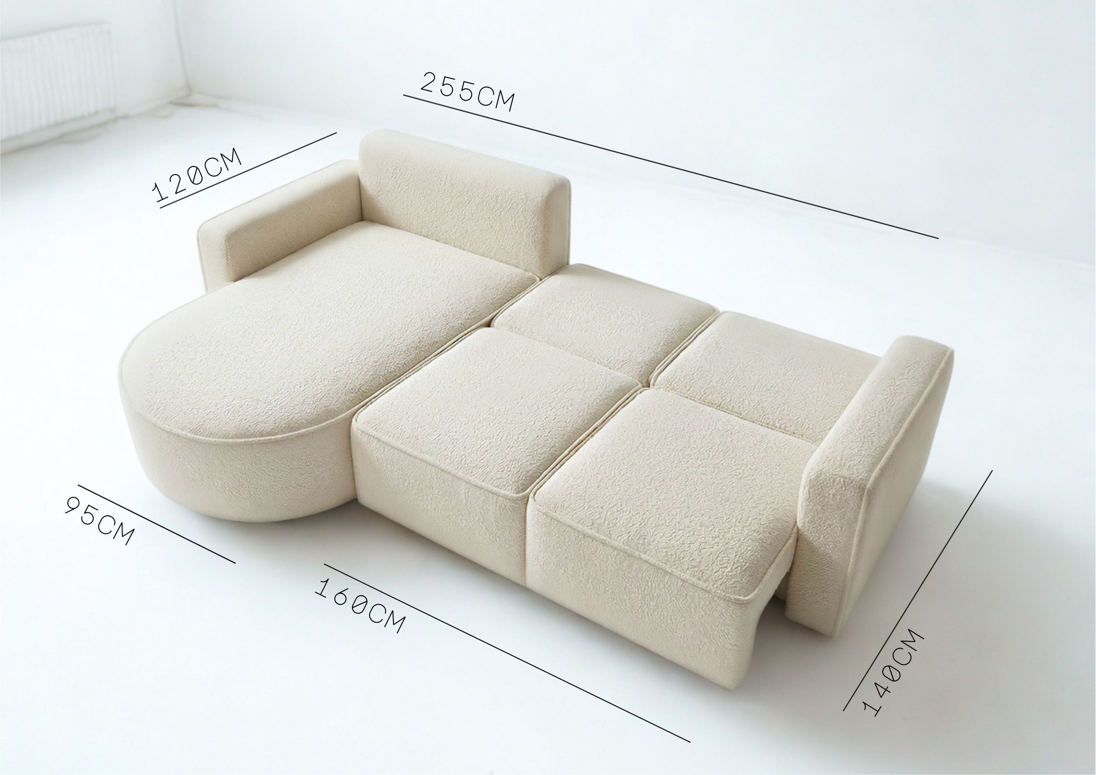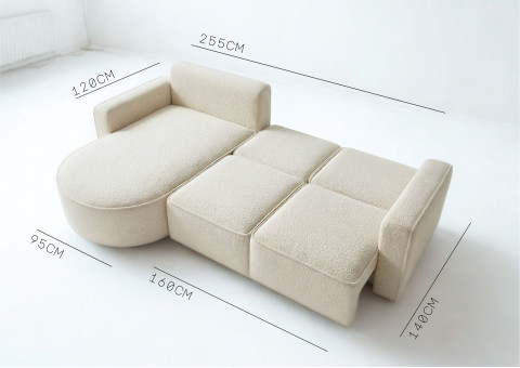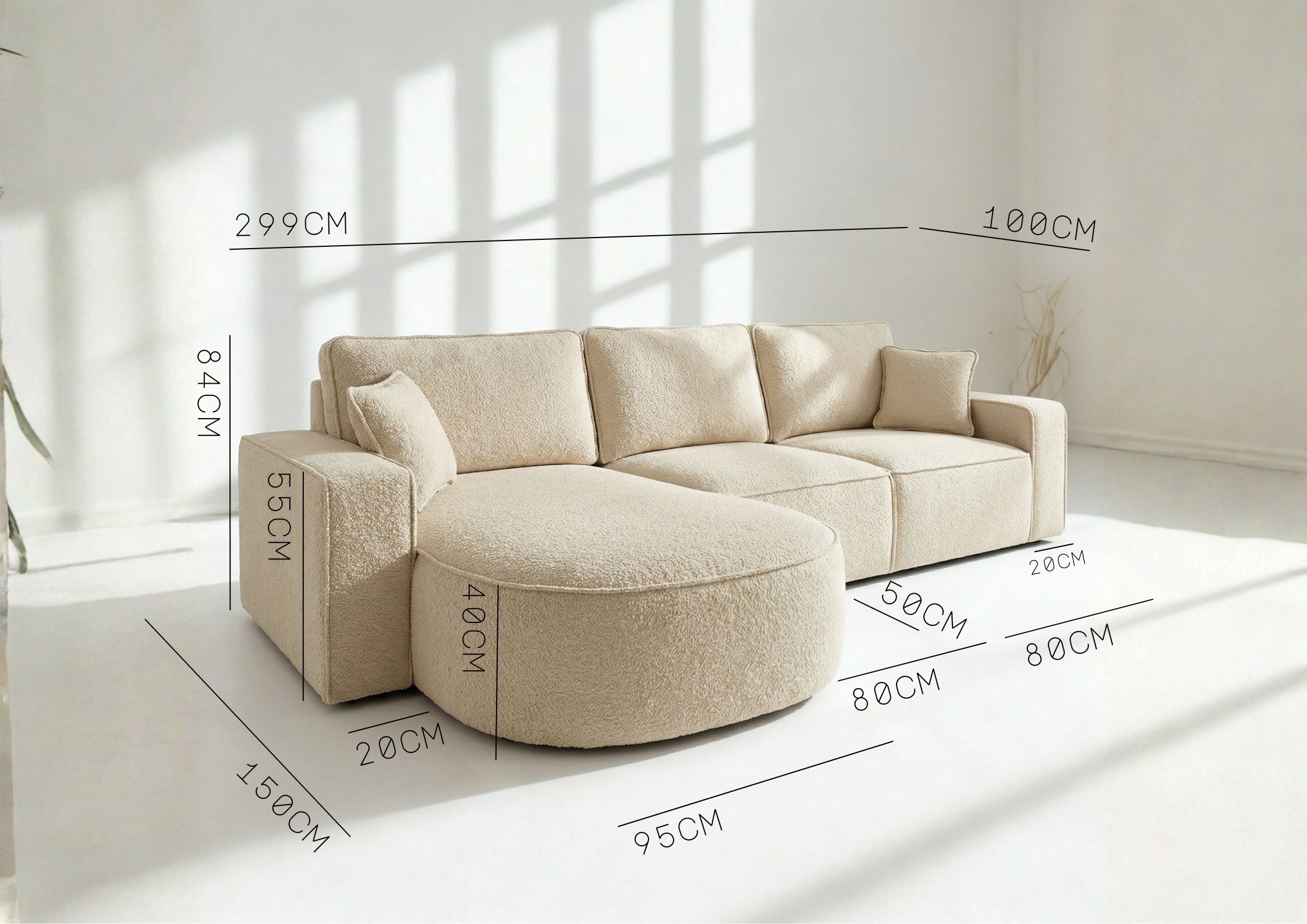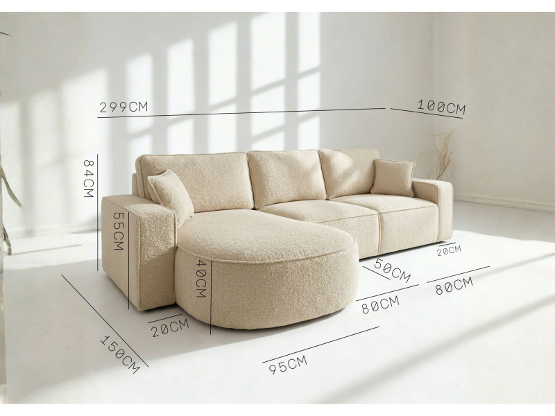 Narożnik GAMMA to duży i wygodny model do salonu, stworzony z myślą o codziennym komforcie. Przestronna powierzchnia siedzisk, podłokietniki oraz miękka tkanina bouclé sprawiają, że mebel dobrze sprawdzi się podczas odpoczynku, spotkań z rodziną i okazjonalnego spania.