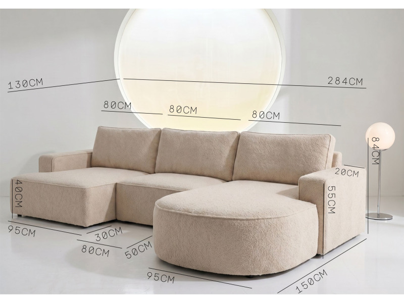Narożnik OMEGA to duży i wygodny model do salonu, zaprojektowany z myślą o codziennym komforcie. Przestronna powierzchnia siedzisk, podłokietniki oraz miękka tkanina bouclé sprawiają, że mebel dobrze sprawdzi się podczas rodzinnego odpoczynku, spotkań z gośćmi i okazjonalnego spania.