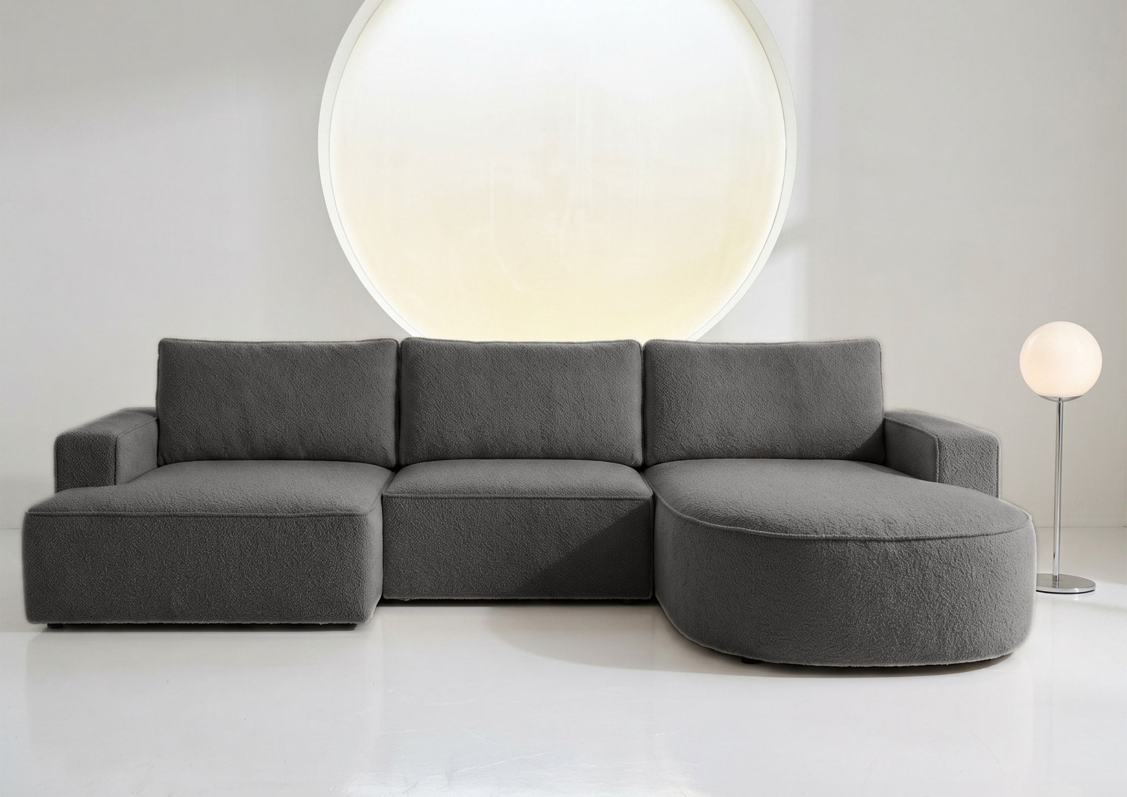 - Narożnik wykonany jest w tkaninie bouclé CENTAUR w grafitowym kolorze.