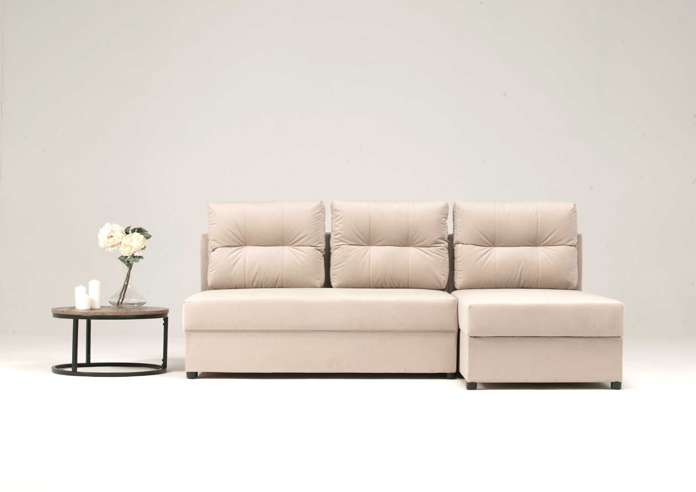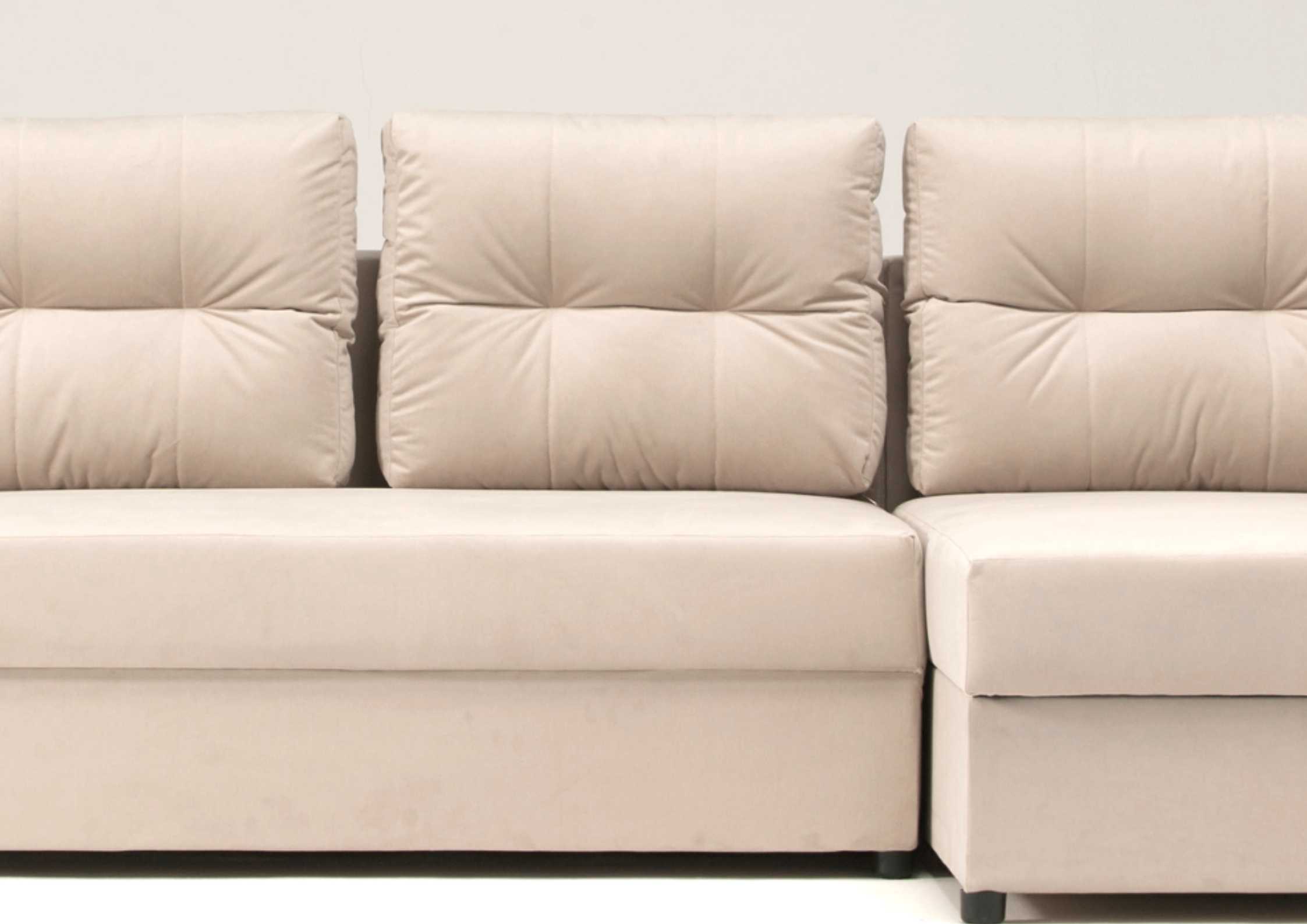 ✔ Mebel wolnostojący! ✔ Zyskujesz maksymalnie wypełnione oparcie i możliwość prania poszewek! ✔ 3 poduszki oparciowe! ✔ Zyskujesz powierzchnię spania 200x140cm! ✔ Schowek na pościel pod elementem funkcyjnym!Mały narożnik z pikowanymi poduszkami Skandi z funkcją spania
