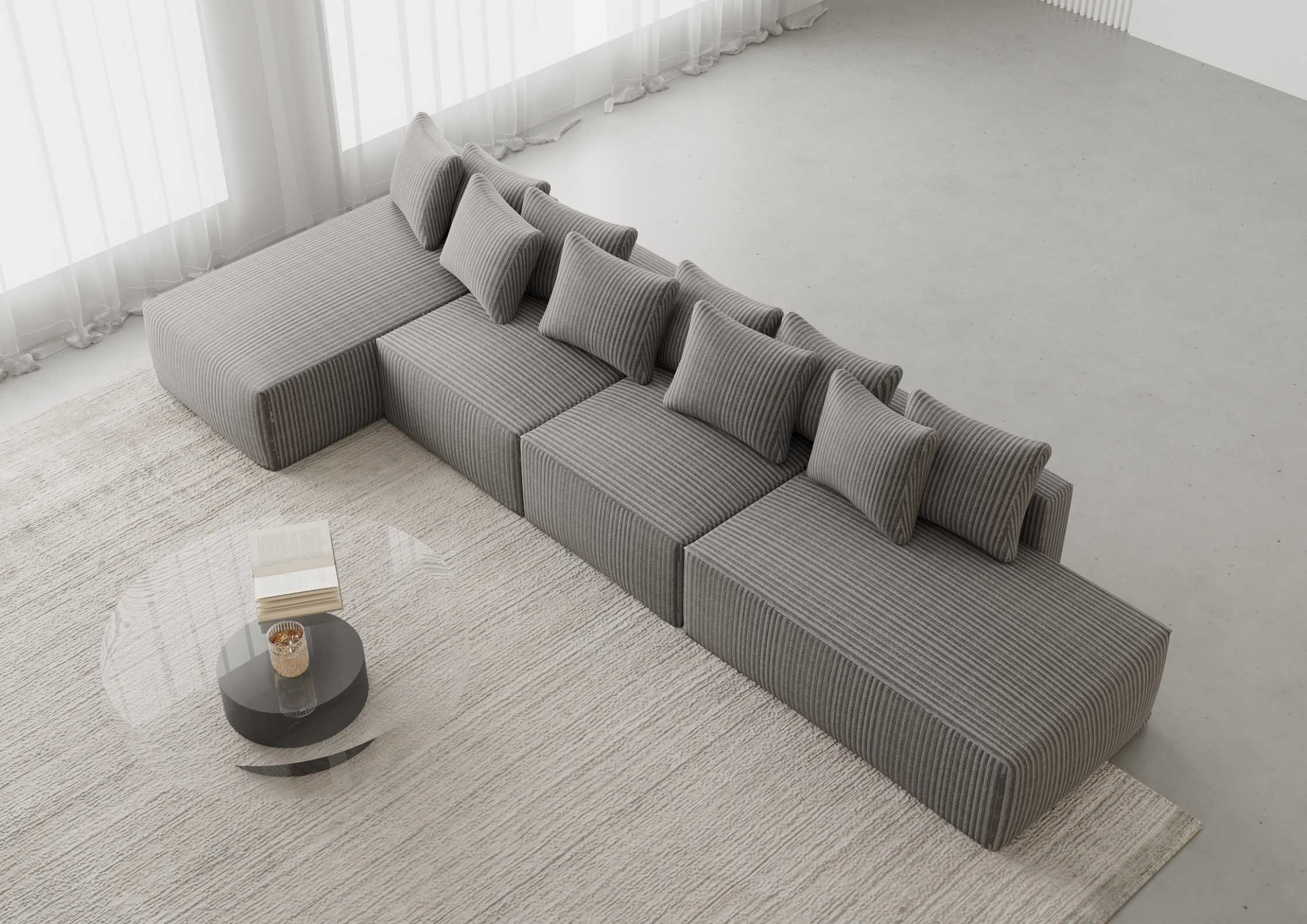 Nowoczesny narożnik modułowy z funkcją spania wyposażyliśmy w dwa pojemniki na pościel. Idealnie sprawdzi się w dużych przestrzeniach wypoczynkowych. 10 wygodnych poduszek uszyjemy z zamkami od spodu, byś mógł zmienić kolory i struktury poszewek- przez co mebel zyska inny charakter. W zależności od wybranej tkaniny mebel nabierze industrialnego lub przytulnago wyglądu.