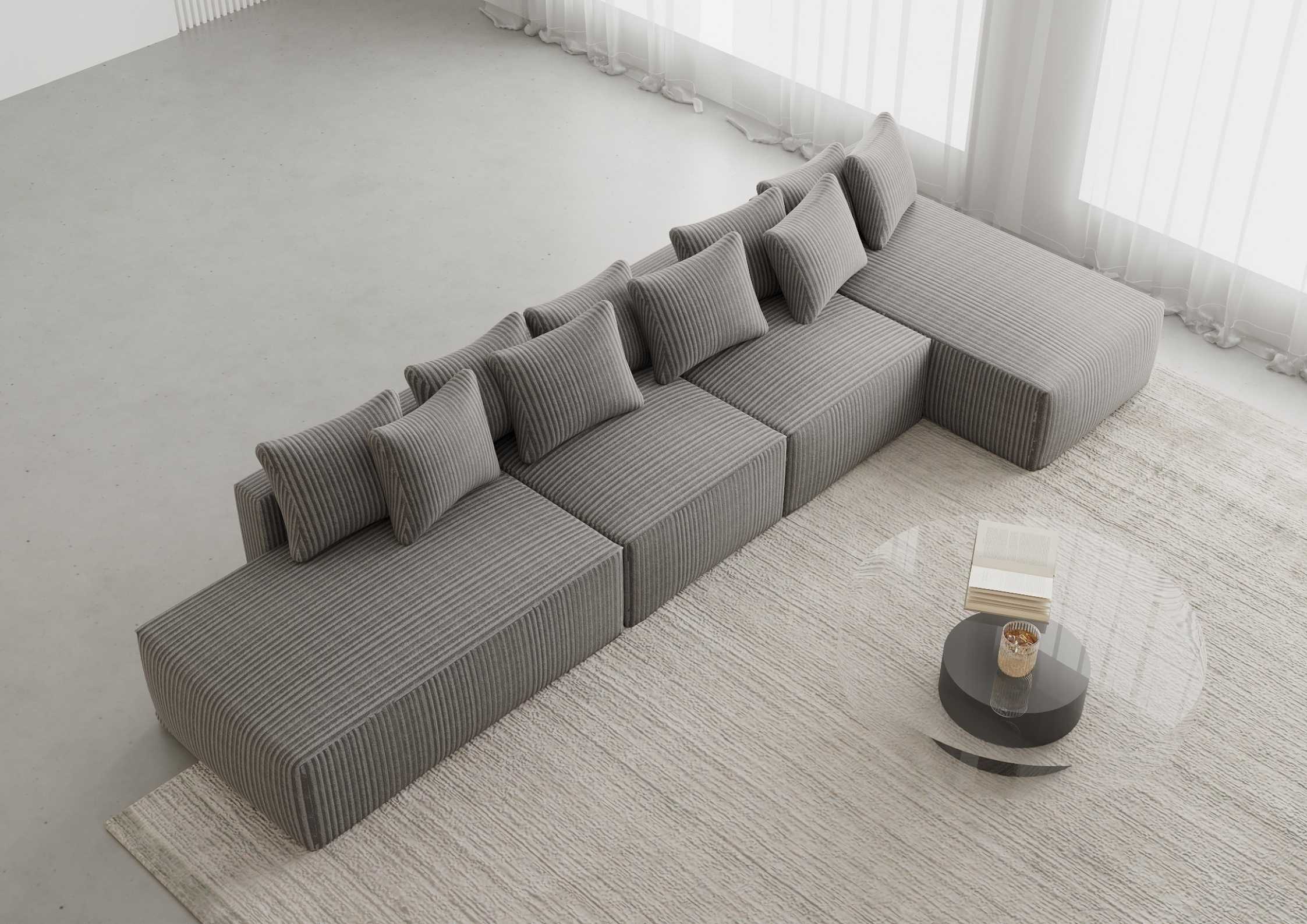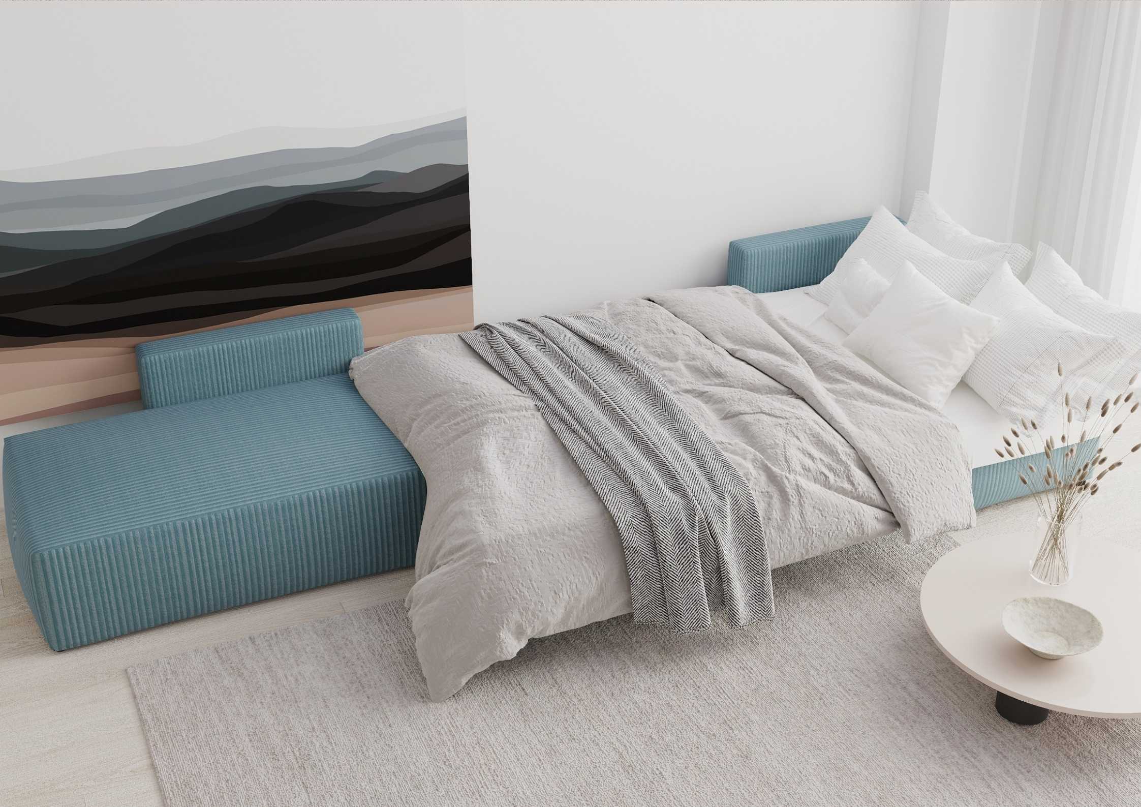 Nowoczesny narożnik modułowy z funkcją spania wyposażyliśmy w dwa pojemniki na pościel. Idealnie sprawdzi się w dużych przestrzeniach wypoczynkowych. 10 wygodnych poduszek uszyjemy z zamkami od spodu, byś mógł zmienić kolory i struktury poszewek- przez co mebel zyska inny charakter. W zależności od wybranej tkaniny mebel nabierze industrialnego lub przytulnago wyglądu.